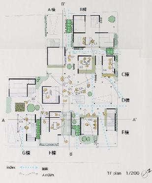 01 身障者の居間と向かいの個室群が向き合う。この周辺の一階分には水回りがないことからも、03でのお花教室の帰りや、04で借りた本を持ち出して居間でくつろぐ。そんな時間の共有のある場。