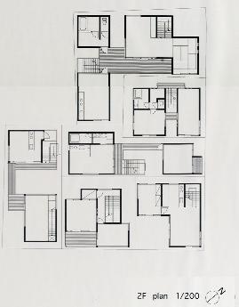 家族という従来の枠組みだけに捉えられない、個人としての地域との関わり方の提案。1Fに個人の部屋を設け積極的に外部と関わっていくことで個が集まることの大切さを、力強さを実感できる。また隣の住戸との適度な距離を持った関係性が期待でき、隣人との関わり、まち全体との関わりという点においてこの1F部分が大きな役割を果たすと考えられる。 |