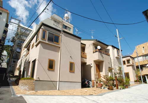 本事業は、山本通りの北に東西に走る道路と、北にのびる細い道の交点の東に南面して建つ 異人館(ボリビア領事館) の再生と、これを望む4区画の敷地からなる戸建て分譲事業である。